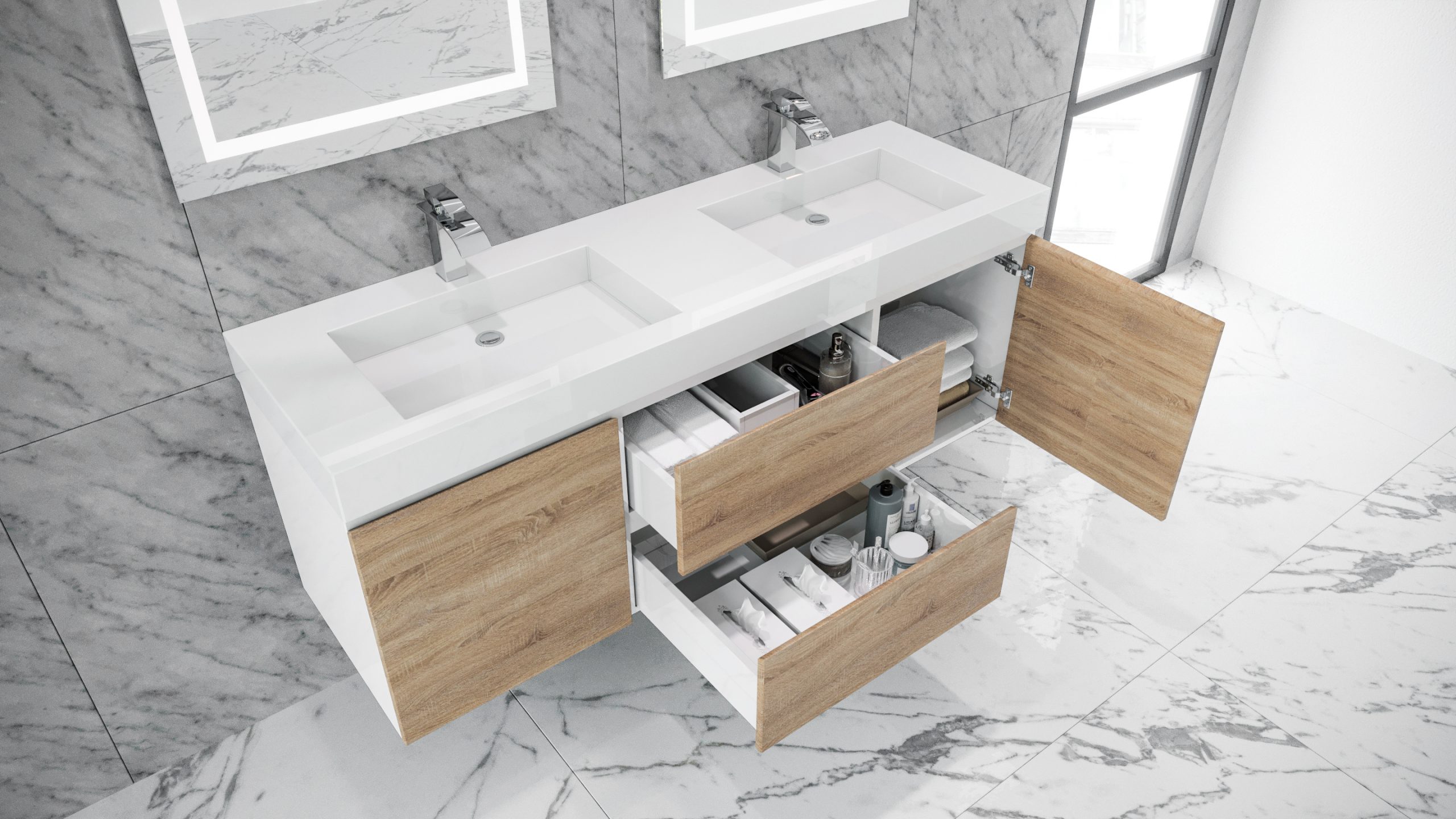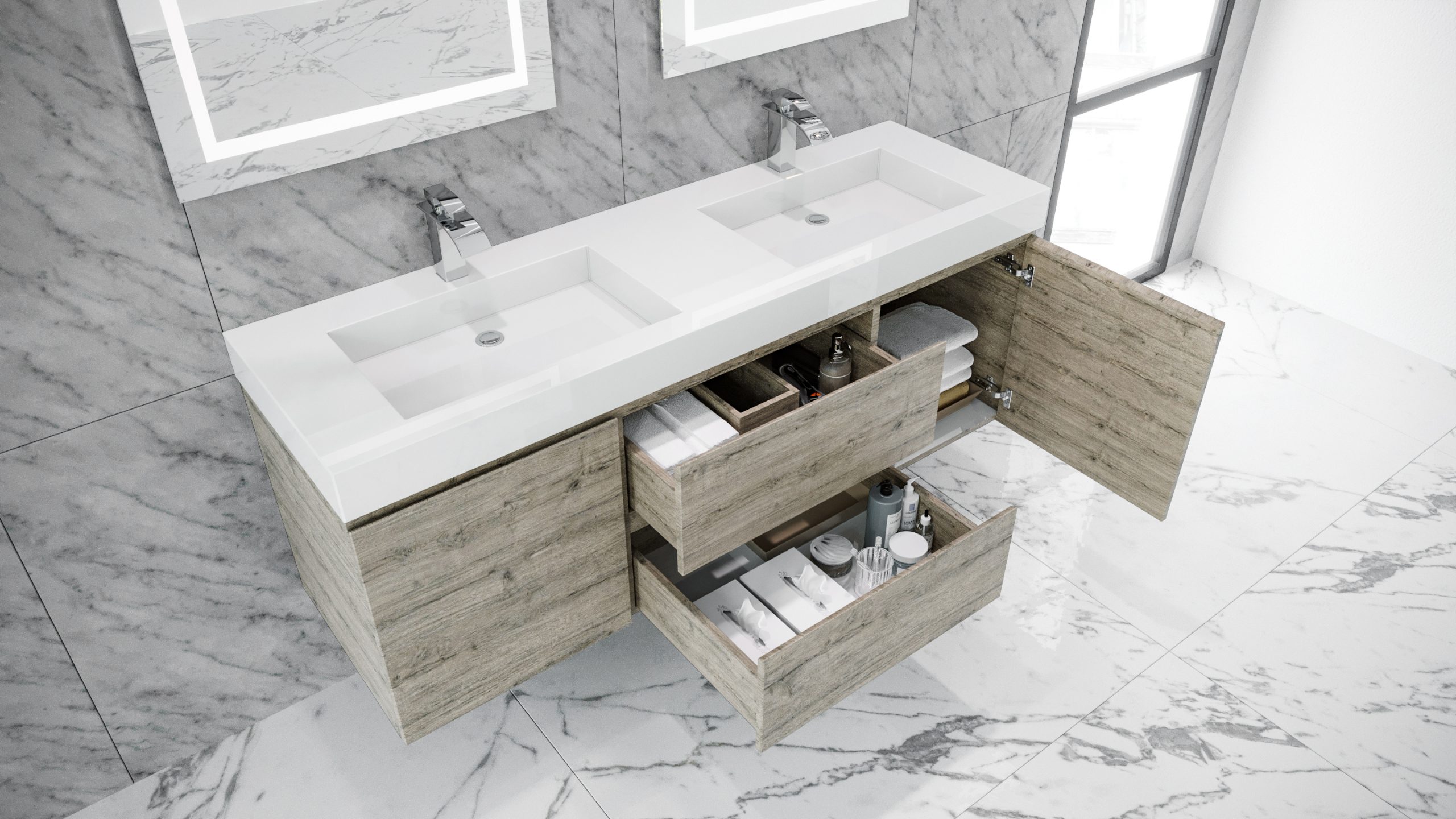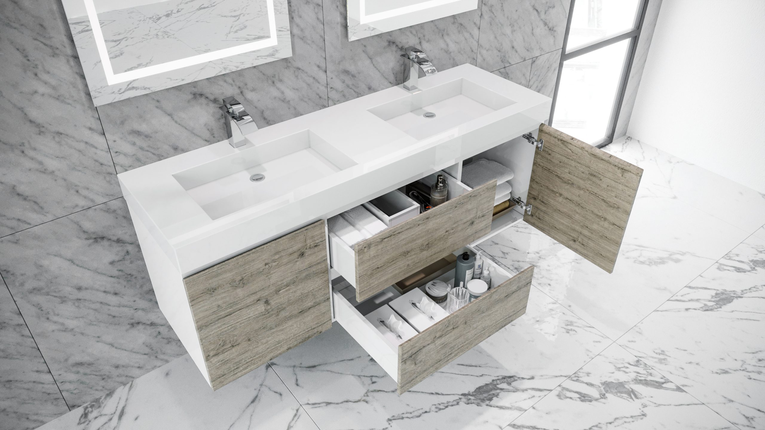Queen 60″ Wall Mount Sonoma White Color With Solid Surface Top (Double Sink)