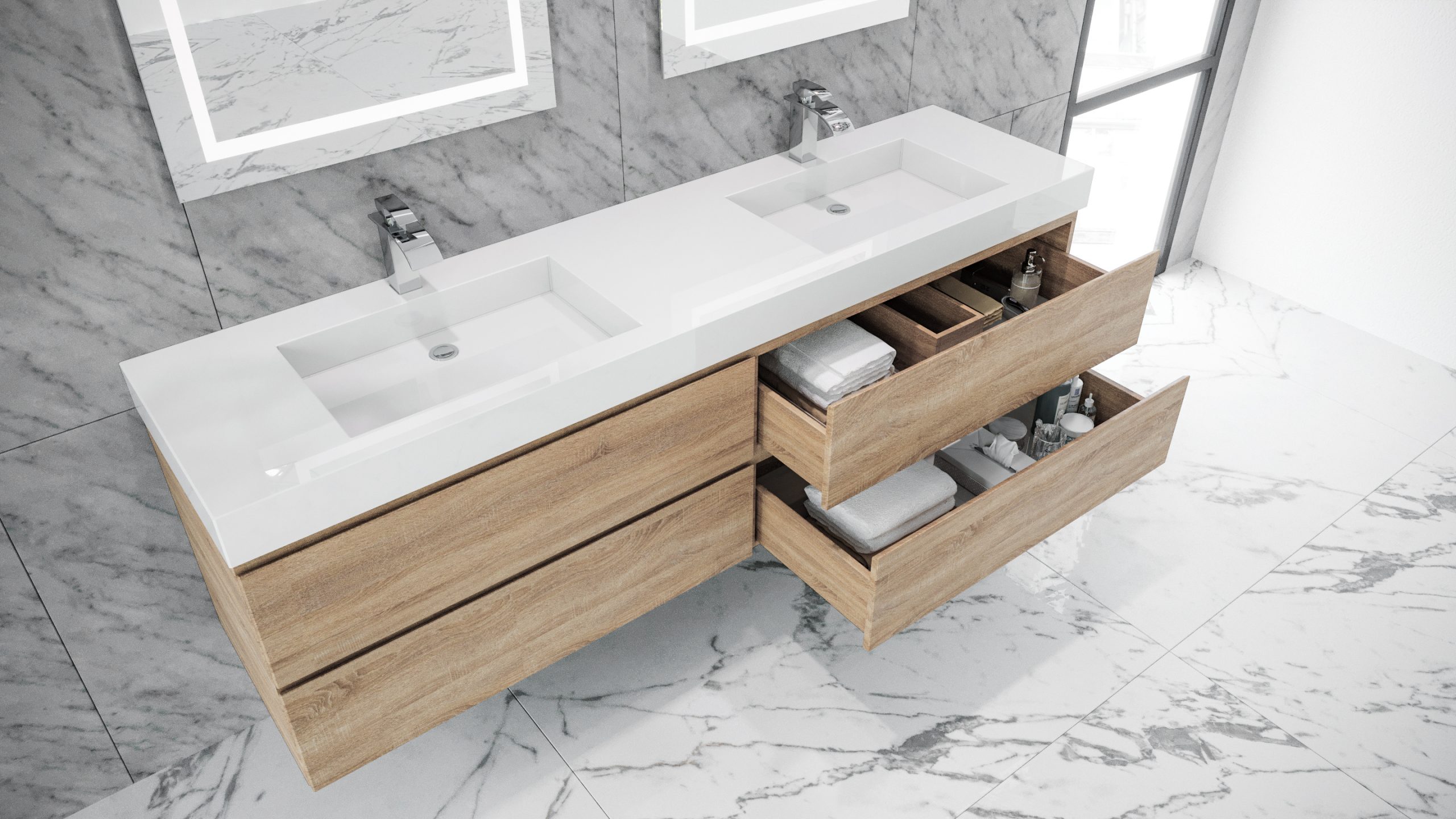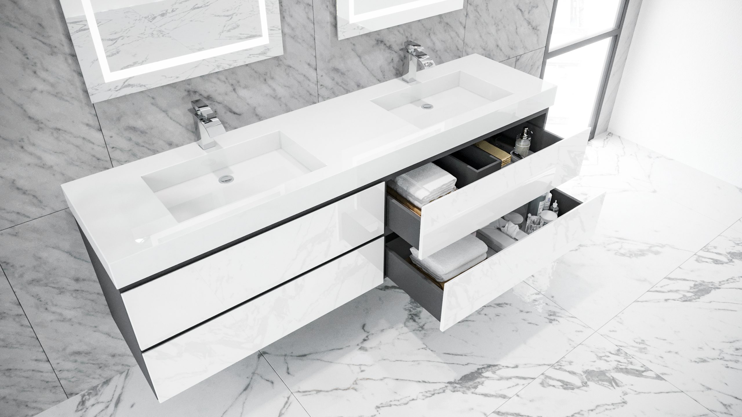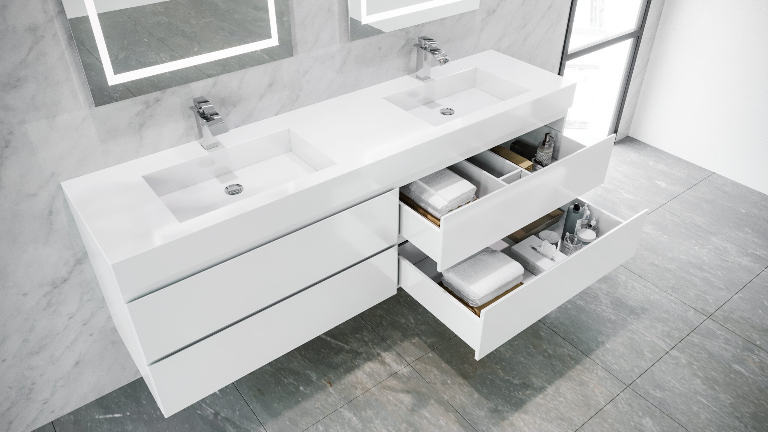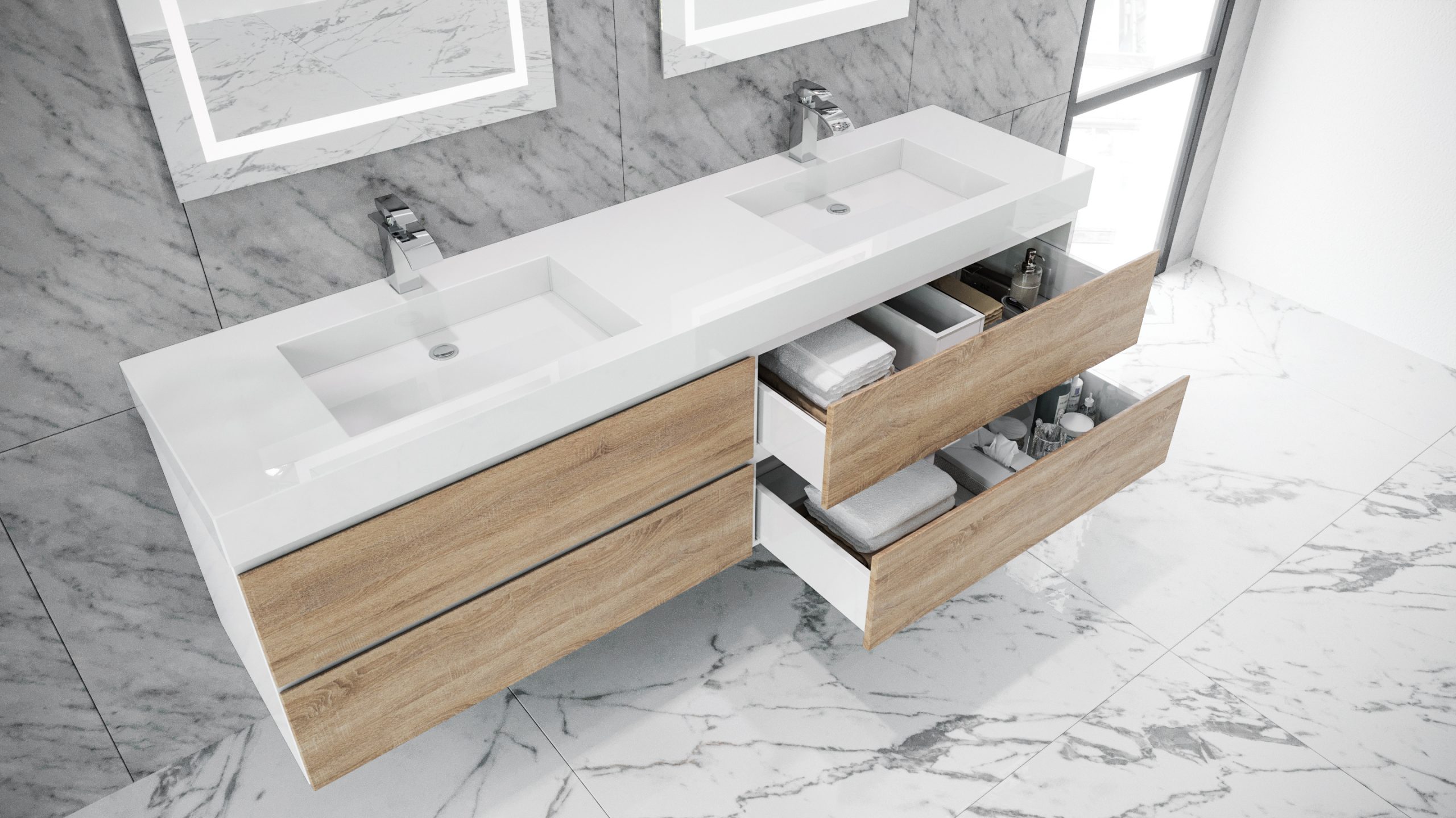 Queen 72″ Wall Mount Sonoma White Color With Solid Surface Top (Double Sink)